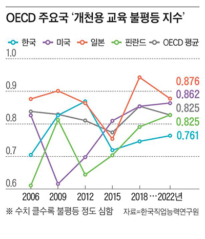그러나 이러한 결과만으로 공교육 전반의 실패라고 단정하기는 어렵다. 학업 성취가 형성되는 이전 단계에 주목하면, 다른 그림이 함께 나타나기 때문이다. 경제협력개발기구(OECD) 국제 학업 성취도 평가(PISA) 2022 결과를 보면, 우리나라의 교육 평등 수준은 여전히 세계적으로 양호하다. 최상위 성취 집단에서 가정 배경이 성취에 미치는 영향은 상대적으로 약하게 나타났고, 공교육을 통해 사회·경제적 배경의 불리함을 일정 부분 상쇄하는 기회 환원 기능도 작동하고 있다. 한국직업능력연구원이 PISA 2006년부터 2022년까지의 결과를 바탕으로 산출한 ‘개천용 교육 불평등 지수’나 ‘상향 이동성 지수’ 역시 OECD 평균은 물론 미국, 일본, 핀란드 등과 비교해 비슷하거나 더 나은 수준을 유지해 왔다. ‘개천용’의 가능성은 여전히 있다.