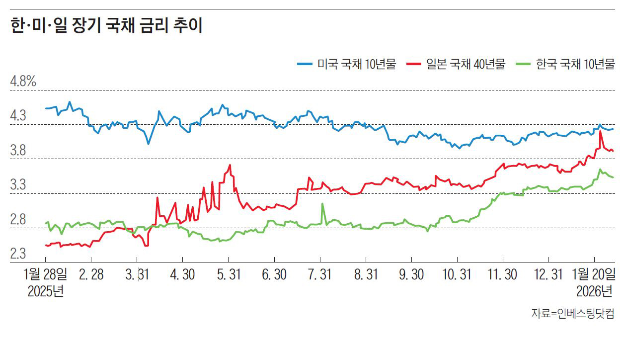 충격은 곧바로 전 세계로 확산했다. 한국에서는 국채 5년물과 10년물이 각각 7.9 와 8.8 상승해 3.465%와 3.653%까지 올랐고, 미국 뉴욕 채권시장에서도 국채 10년물, 30년물 금리가 3~5 씩 오른 4.295%와 4.921%로 뛰었다. 유럽에서도 영국·프랑스·독일 등 주요국 국채 금리가 일제히 상승했다. 이후 도널드 트럼프 미국 대통령(이하 트럼프)의 덴마크령 그린란드 병합 요구를 둘러싼 불확실성이 일부 해소되며 금리 상승세가 제한적으로 되돌려졌지만, 채권시장은 여전히 기조적 약세에 빠져있다. 1월 30일 기준 일본 국채 40년물 금리는 3.9% 안팎에 있고, 한국과 미국의 10년물 국채 금리도 기준금리 대비 50~110 높은 수준을 유지하고 있다.