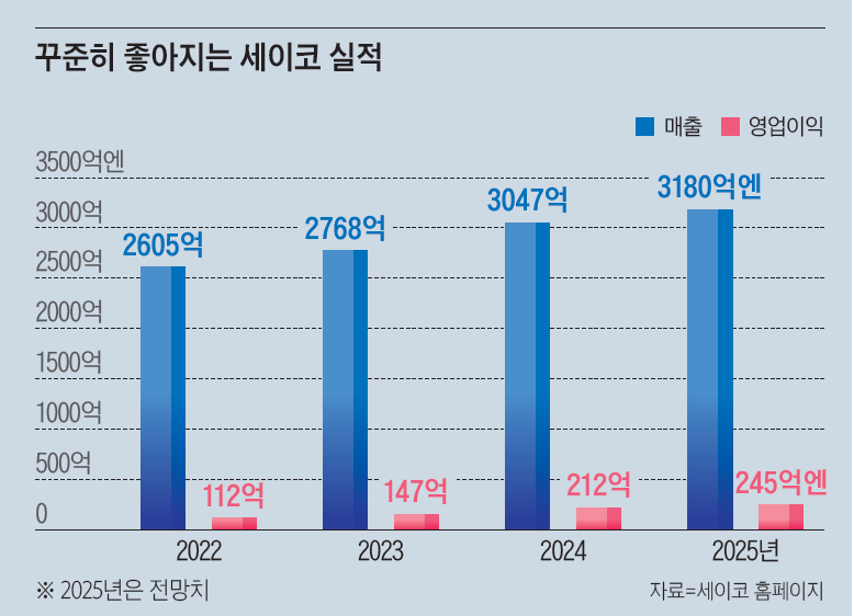 2025년 일본을 방문한 외국인 관광객이 역대 처음으로 4000만 명을 넘어선 것도 실적 호전 배경이다. 부유한 외국인 관광객이 그랜드 세이코 시계를 많이 구입한다. 2024회계연도(3월 결산)에 세이코 매출은 3000억엔(약 2조8100원), 영업이익은 200억엔(약 1874억원)을 넘어섰다. 3월 말 끝나는 2025회계연도에도 매출과 영업이익 모두 증가할 전망이다.