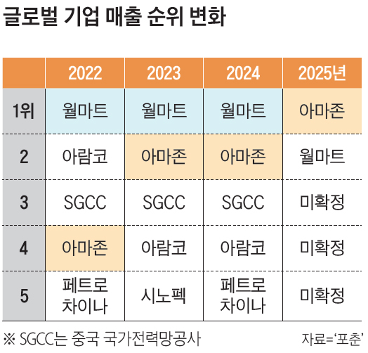 아마존이 2월 5일(이하 현지시각) 발표한 2025년 연간 매출은 7169억달러(약 1036조2790억원)였다. 반면 2월 19일에 발표한 월마트의 같은 기간 매출은 7132억달러(약 1030조9300억원)였다. 전년 대비 4.7% 증가한 액수지만, 세계 최대 매출 기업의 자리는 아마존에 내줘야 했다. 월마트는 2012년 엑손모빌을 누른 후 13년 연속 글로벌 최대 매출 기업 지위를 지켜왔다.