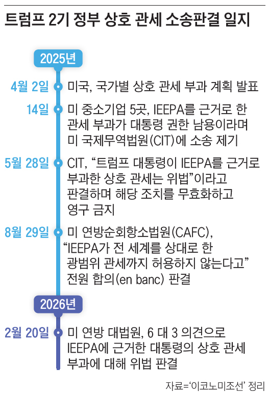 도널드 트럼프 미국 대통령(이하 트럼프)이 무역 적자 해소와 국내 제조업 부흥을 명분으로 전 세계를 상대로 2025년 4월부터 강행해 온 핵심 정책 ‘상호 관세’가 2월 20일(이하 현지시각) 미국 연방 대법원에서 최종 위법 판결을 받았다. 이에 따라 관세 면제를 대가로 미국과 새로운 무역 합의를 맺었던 한국 등 주요 교역국을 둘러싼 불확실성도 커질 전망이다. 관세가 무효화할 경우 “미국이 망할 수 있다”고까지 주장하며 연방 대법원을 압박했던 트럼프는 여러 무역법을 동원해 새로운 관세 부과 근거 마련에 총력을 기울이고 있다. 이번 판결을 둘러싼 주요 논점을 문답 형식으로 정리했다.