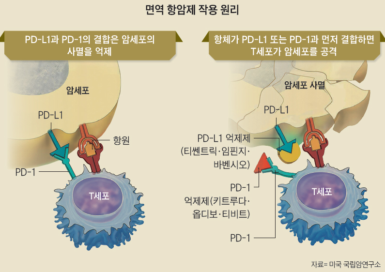 이번에 투여한 키트루다와 티비트는 면역 관문을 억제해 T세포가 원래대로 암세포를 공격하게 한다. 둘 다 암세포보다 먼저 T세포의 PD-1과 결합하는 항체 의약품이다. 반대로 암세포의 PD-L1을 억제하는 방식의 면역 항암제도 있다. 티쎈트릭, 임핀지, 바벤시오 등이 그렇다.