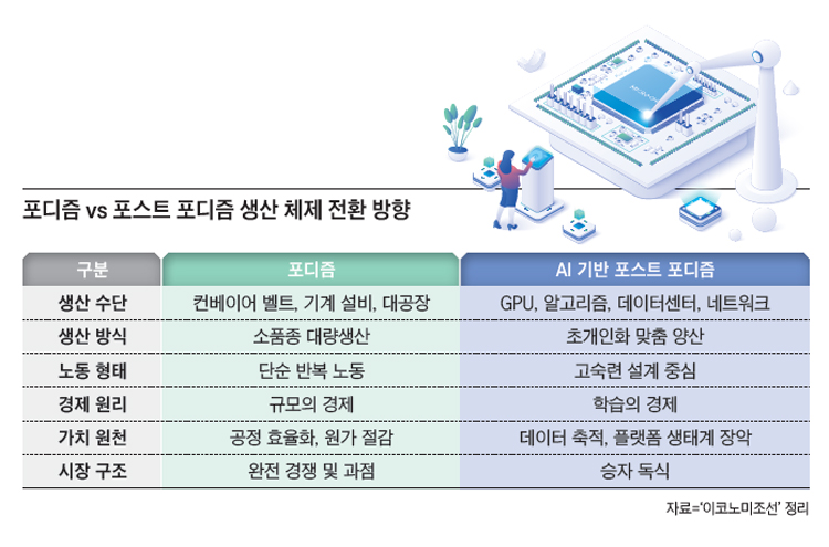 포스트 포디즘(Post Fordism) 헨리 포드의 컨베이어벨트 기반 대량생산 체제인 포디즘에서 출발한 개념으로, 표준화된 대량생산에서 벗어나 맞춤형·유연 생산으로 전환된 생산방식을 의미한다. AI 시대에 데이터·알고리즘으로 개인별 최적화 서비스를 실시간으로 제공하면서 이 같은 생산방식이 산업 전반으로 확산하고 있다.